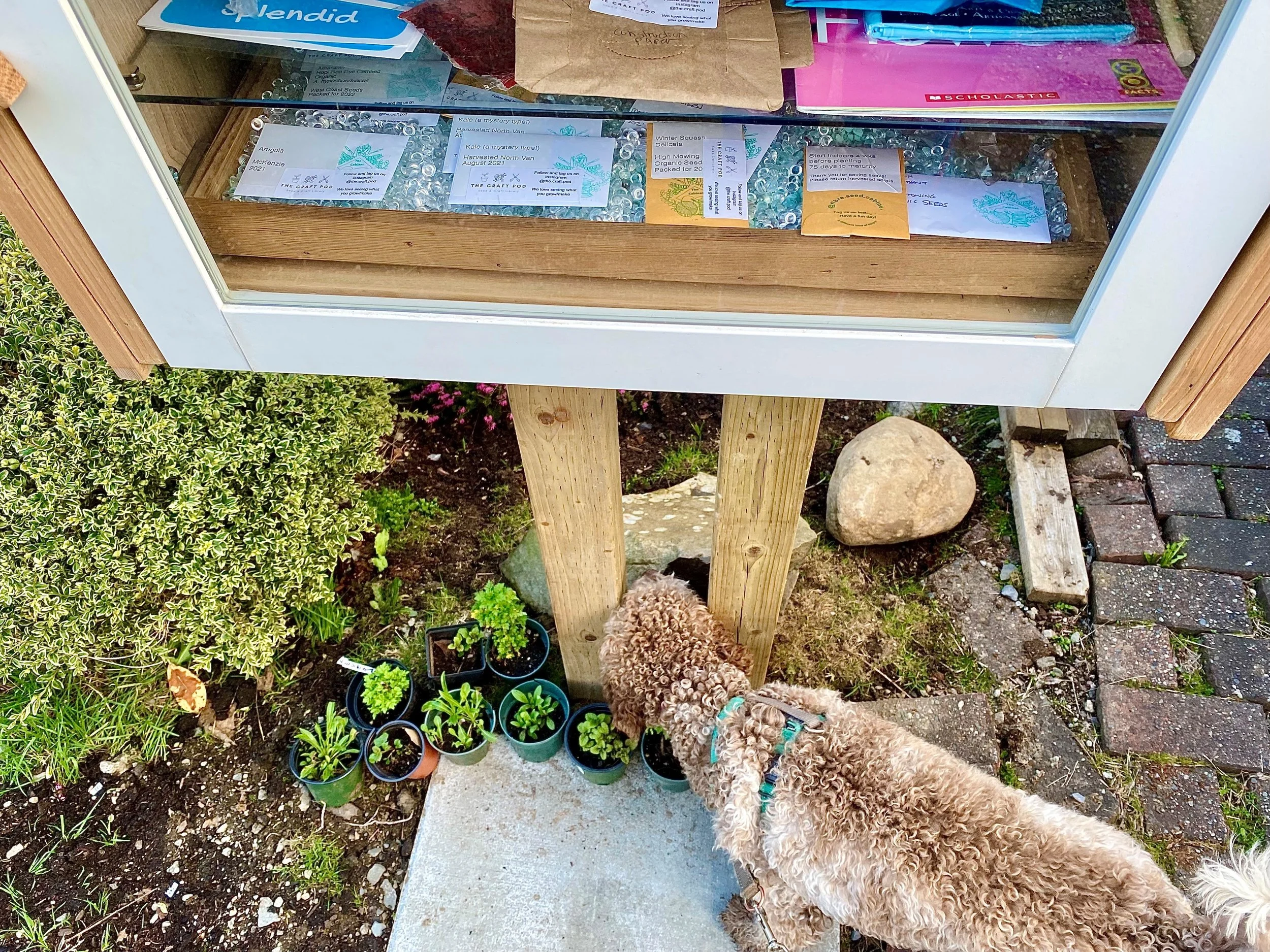 I was on a neighborhood WALK with my pup a few days ago, and we happened upon what I thought was one of those 'Take One, Leave One' library stands. Roma wanted a sniff so we meandered over, and the colour of the items inside the stand caught my eye. I'm not sure of all the items in that stand, but on the lower shelf there are little packets of seeds!