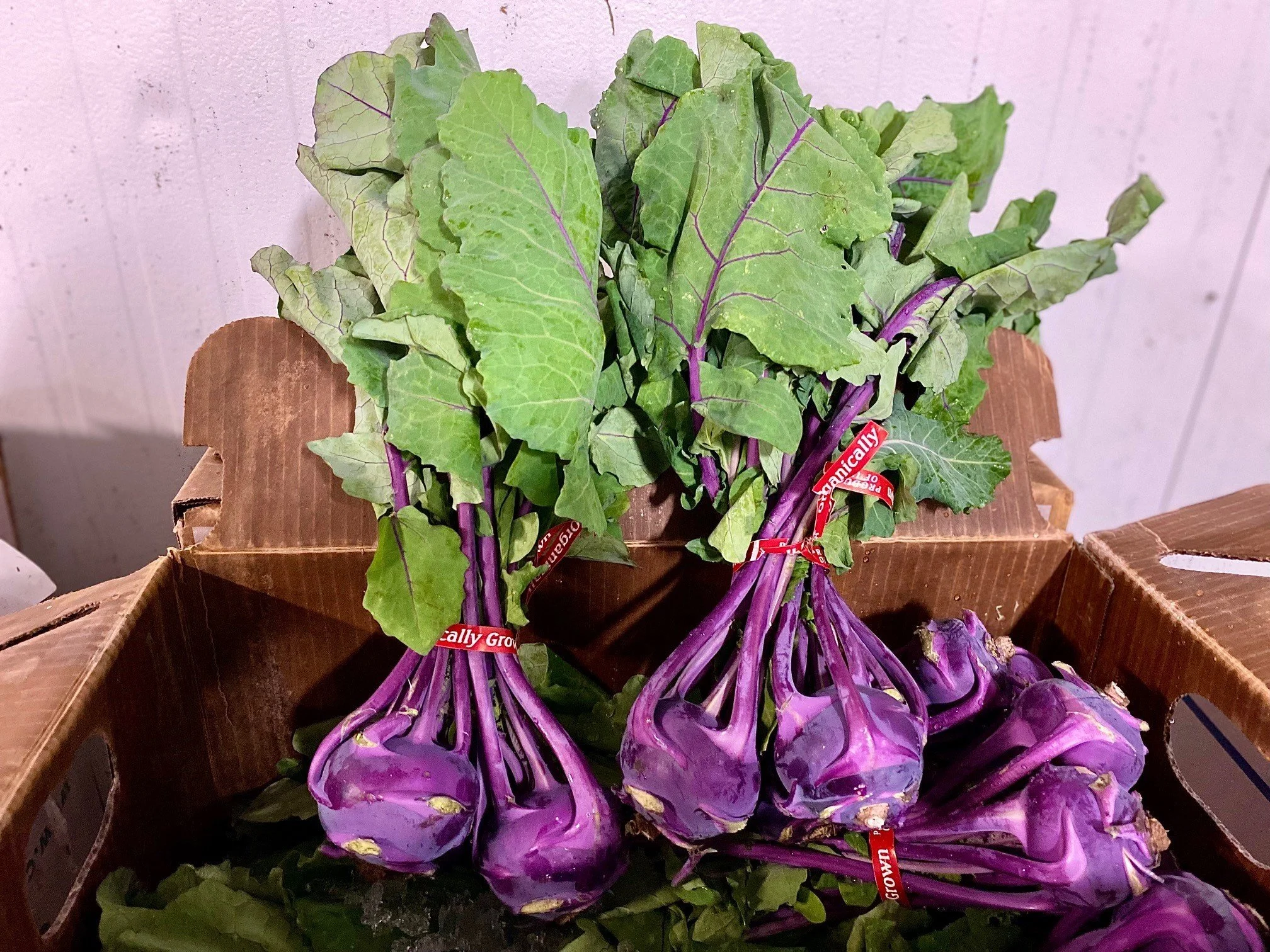 Kohlrabi is well suited to a chopped slaw or roasted. Its flavour profile is a bit peppery, sweet and could be compared to broccoli, cabbage and cucumber.