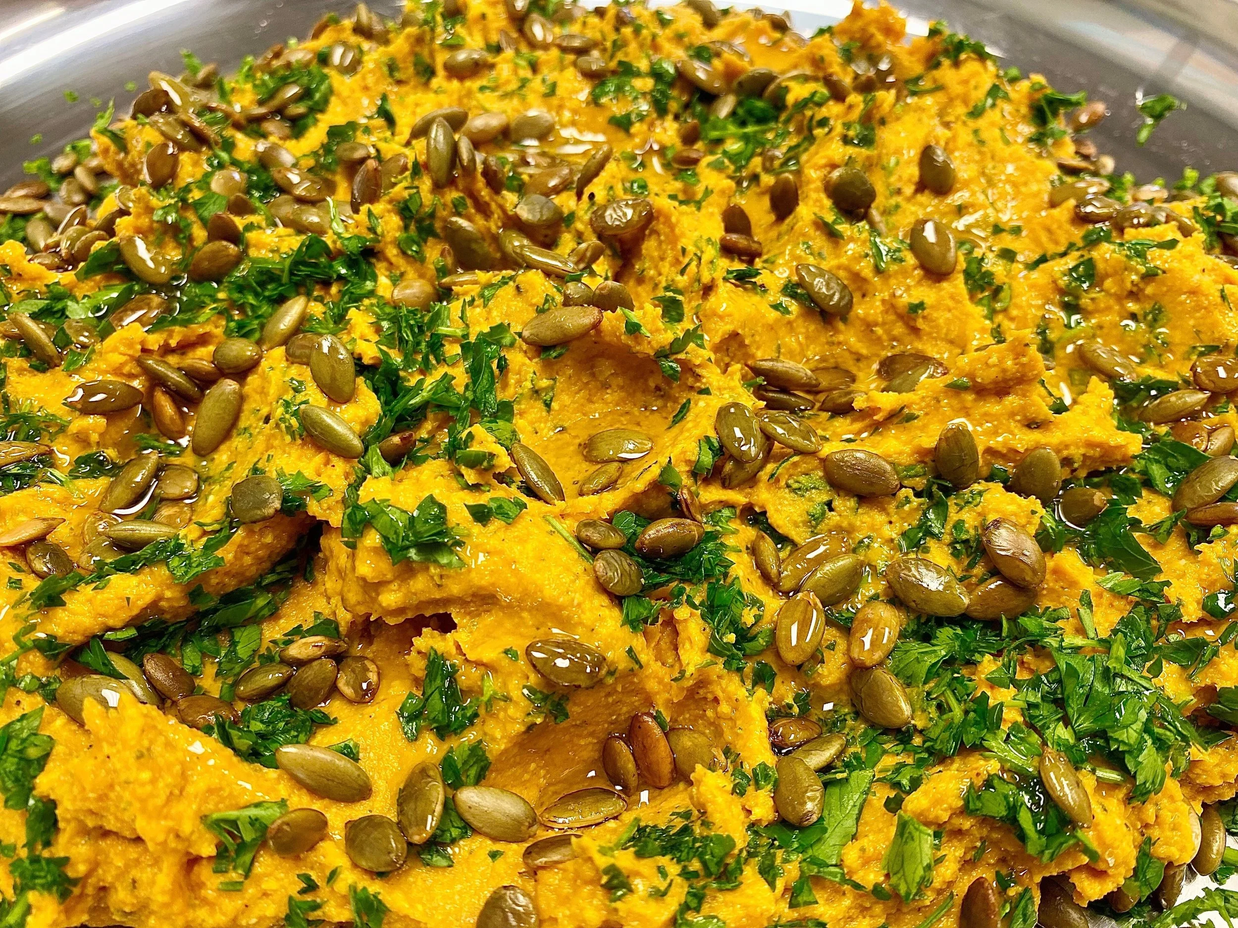 The recipe is: roasted carrots sprinkled with paprika, raw garlic, cashews, chick peas (garbanzo beans), olive oil, lemon juice, salt & pepper and topped with fresh parsley and pumpkin seeds. Throw that all together in a food processor/blender and you're good to go!